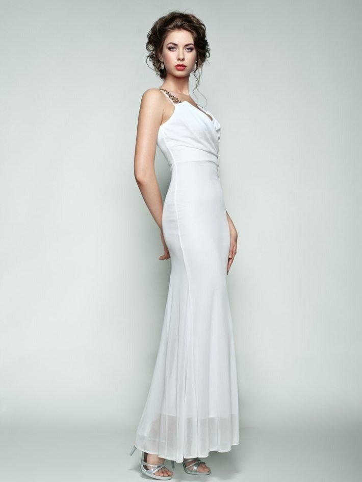Vestido largo de noche plisado en lamé dorado con diseño cruzado y aberturas laterales.
